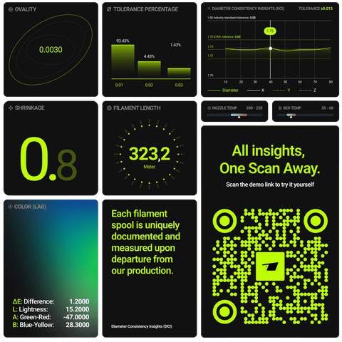Wanneer u de DCI QR-code scant, wacht u een wereld aan nauwkeurige filamentgegevens. U krijgt toegang tot een reeks essentiële categorieën, waaronder ovaliteit, krimp, LAB-kleuren, kleur, lengte, diameter, gewicht en materiaal.